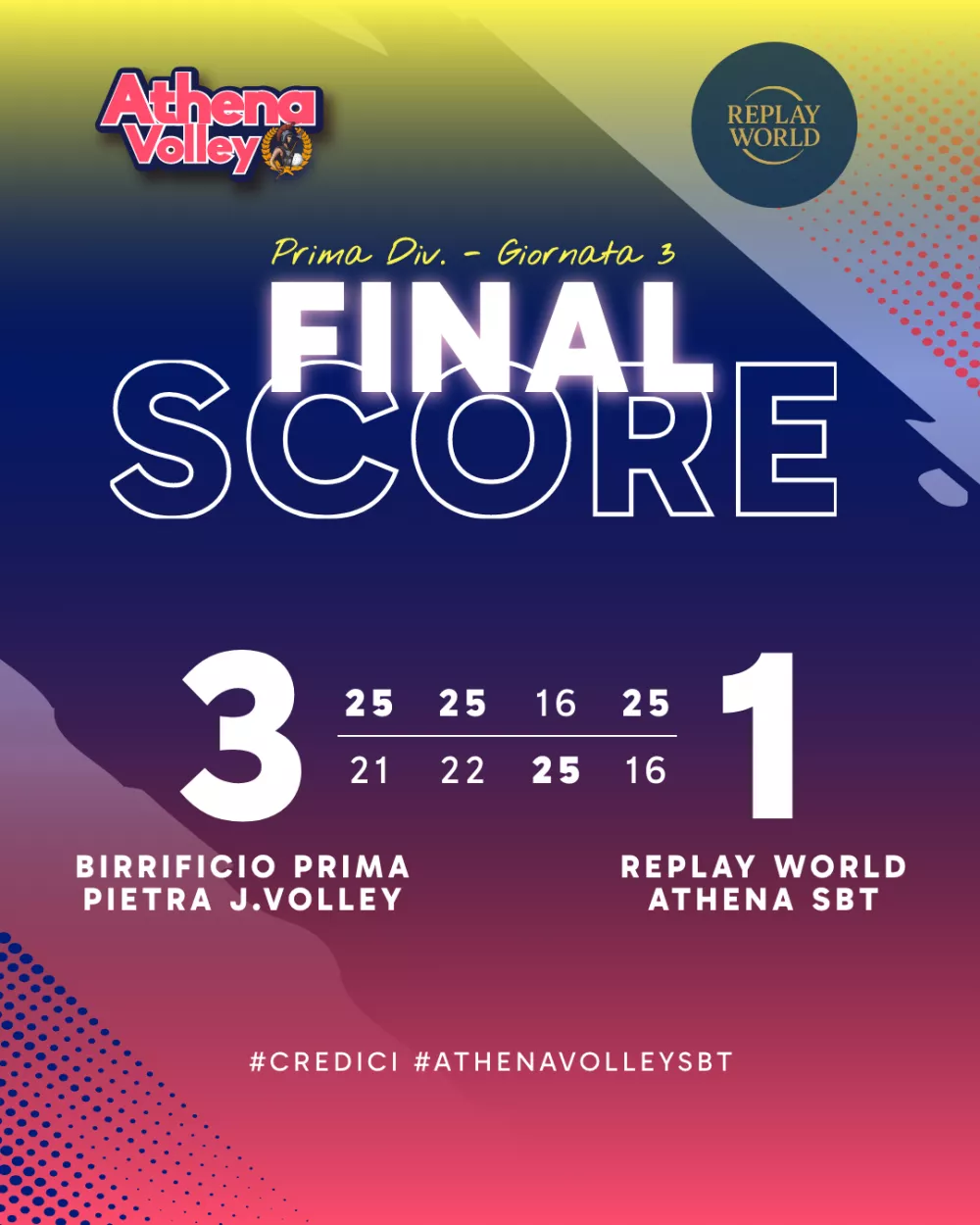 Partita dai due volti quella disputata oggi dalla Replay World Athena SBT. I primi due set sono stati difficili, con le nostre giovani atlete bloccate e passive, incapaci di esprimere il loro gioco. Sembrava ormai tutto deciso a favore delle avversarie.