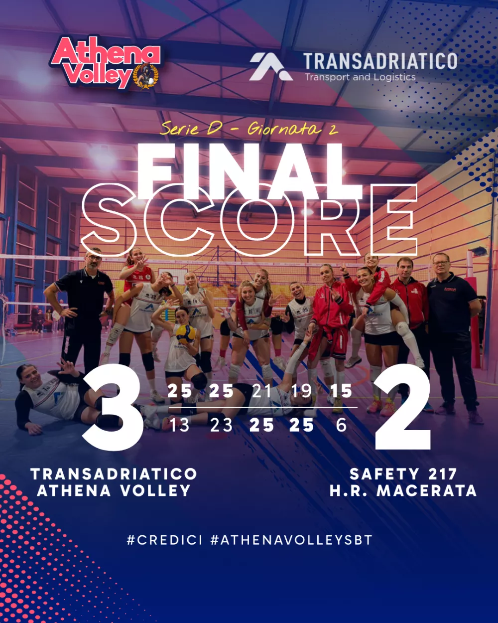 Serie D: Transadriatico Athena Volley – H.R. Macerata 3–2 (25-13, 25-23, 21-25, 19-25, 15-6)