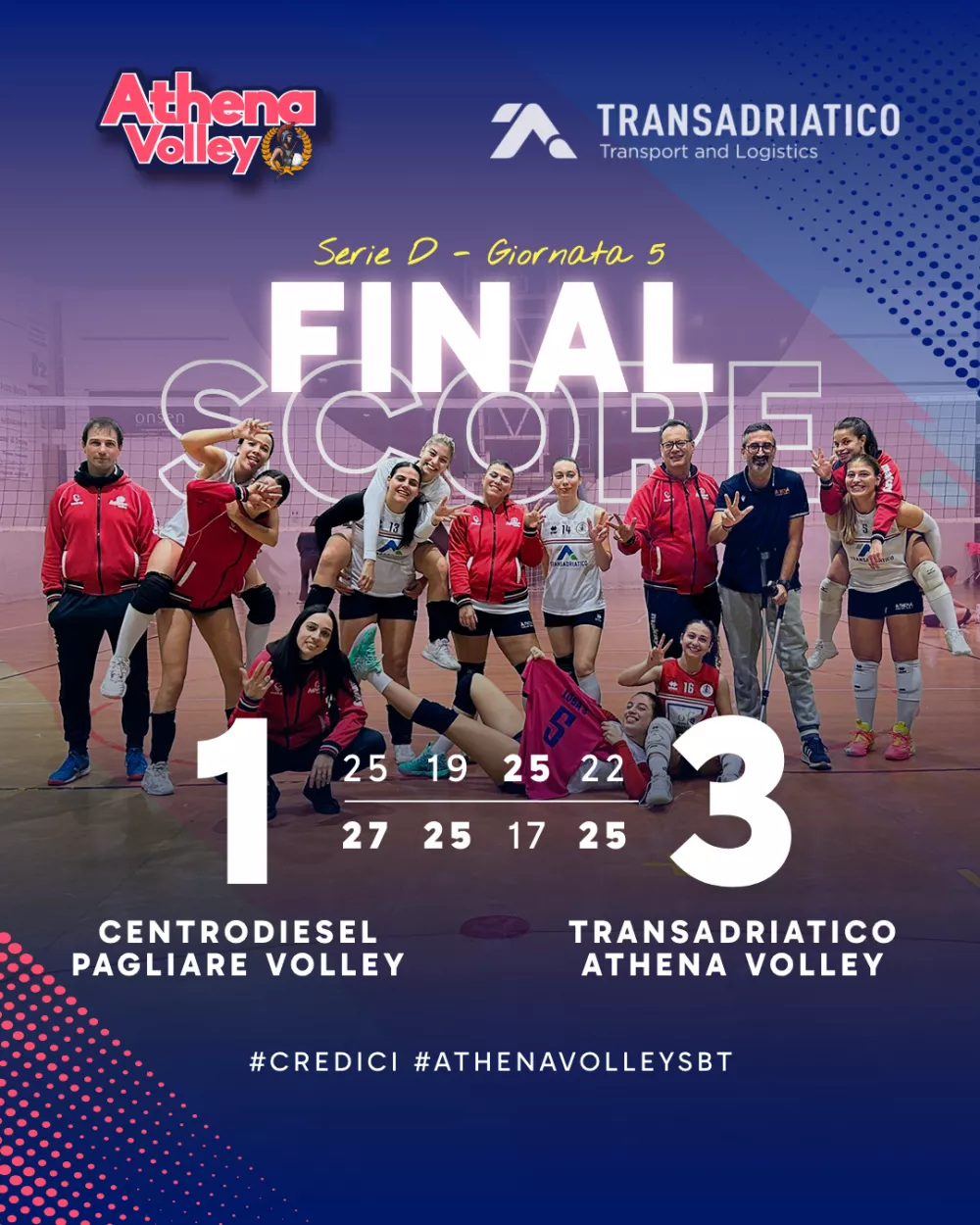 Quinta gara di campionato per la Transadriatico Athena Volley, che affronta in trasferta la Centrodiesel Pagliare Volley. La partita si è rivelata agonisticamente intensa: le ragazze dell’Athena hanno dovuto faticare, mostrando grande carattere, per portare a casa una vittoria importante e meritata contro un avversario ben organizzato e combattivo su ogni palla.