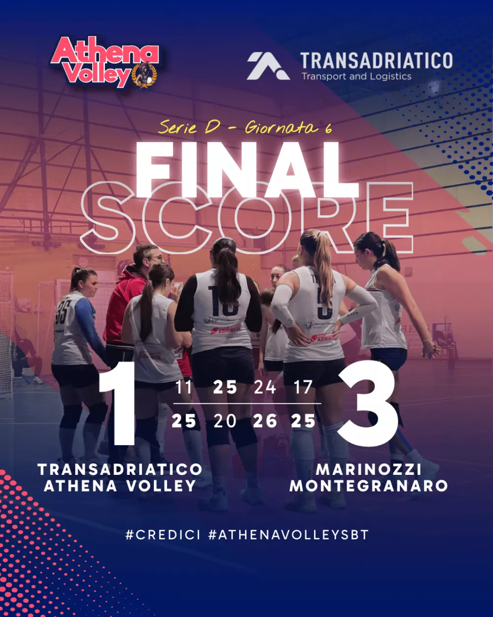 Sesta giornata di campionato per la Transadriatico Athena Volley, impegnata in casa contro la Marinozzi Montegranaro, attuale capolista del girone. Un confronto impegnativo, che ha mostrato sia i limiti sia le potenzialità della squadra sambenedettese.